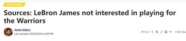 北京时间3月10日,据Lakers Daily消息源透露:如果勒布朗-詹姆斯今年休赛期不退役,他下赛季无意为金州勇士效力。