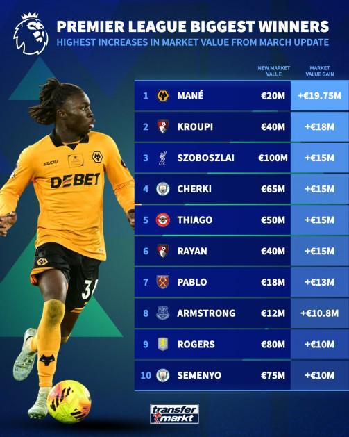 北京时间3月9日,德转更新新一期英超身价。其中索博斯洛伊身价上涨1500万欧达1亿欧元,谢尔基上涨1500万欧>>