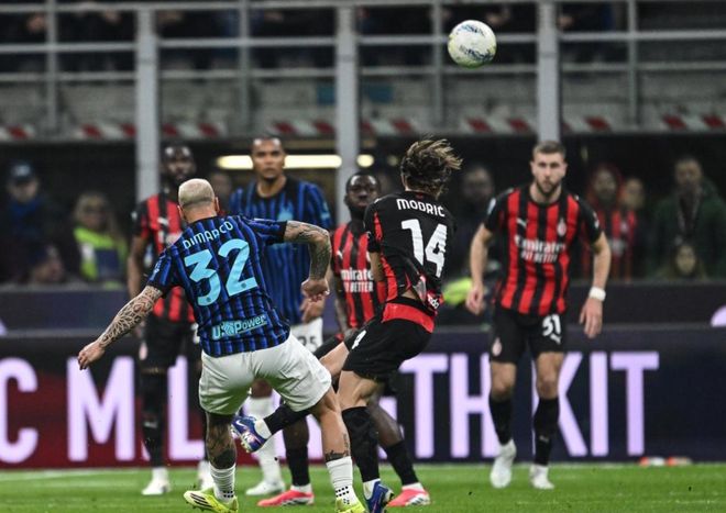 下半场易边再战。泽林斯基的小角度射门被扑了出去,随后,莱奥在禁区左侧的低射踢偏了。福法纳的远射则被扑了出去。迪马尔科禁区中路获得好机会,结果射门踢飞了。国际米兰不断进行换人调整,先是派上邓弗里斯和苏契奇,随后换上奥古斯托和弗拉泰西,最后时刻派上迪乌夫。但这些换人都没有作用。国际米兰始终无法进球。最终,AC米兰1-0击败国际米兰。阿莱格里神了,率队双杀国际米兰。
