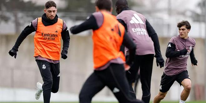 球员们在训练场开始了热身激活与多项抢圈训练,随后进行了控球训练和丢球后的逼抢练习。训练以战术演练和一场对抗赛结束。阿拉巴、贝林厄姆、塞瓦略斯、姆巴佩、米利唐和罗德里戈仍在恢复进程中。